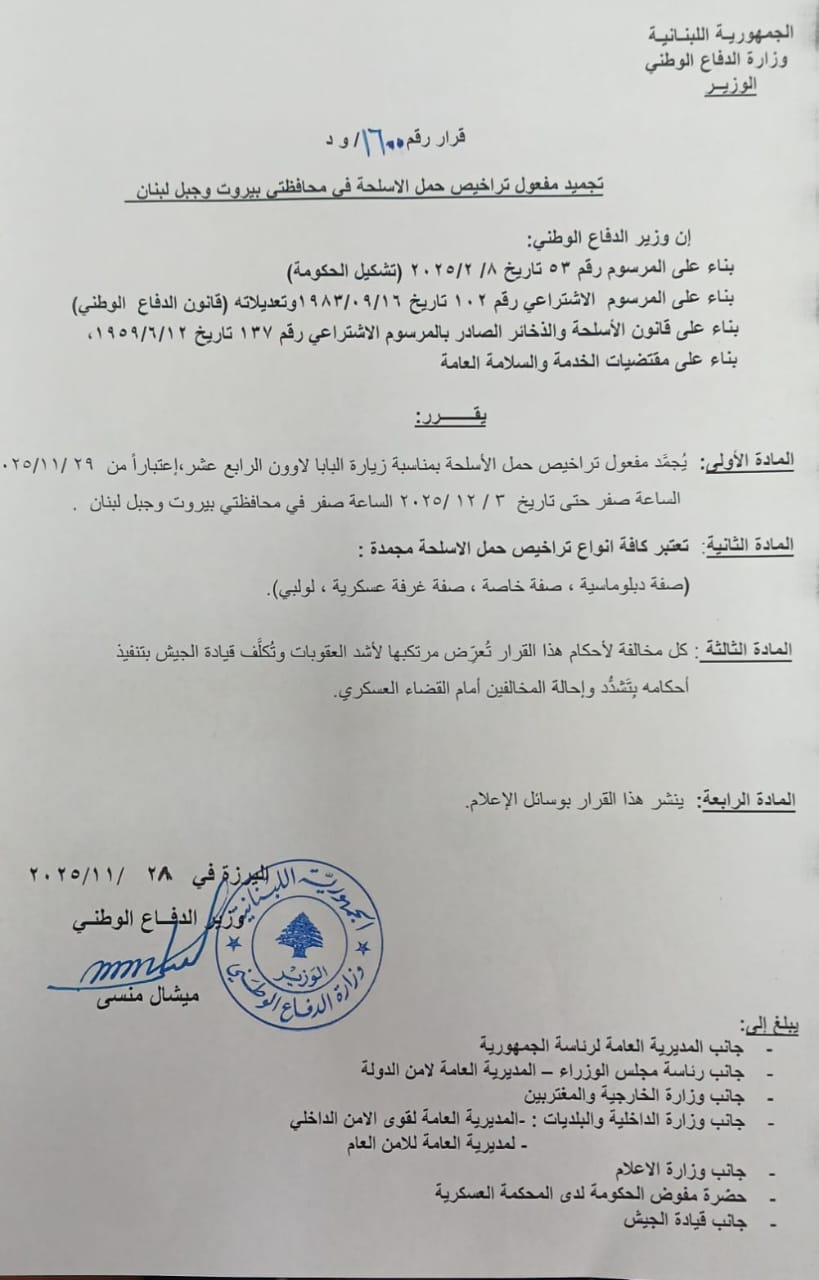 تجميد مفعول تراخيص حمل الأسلحة في محافظتي بيروت وجبل لبنان